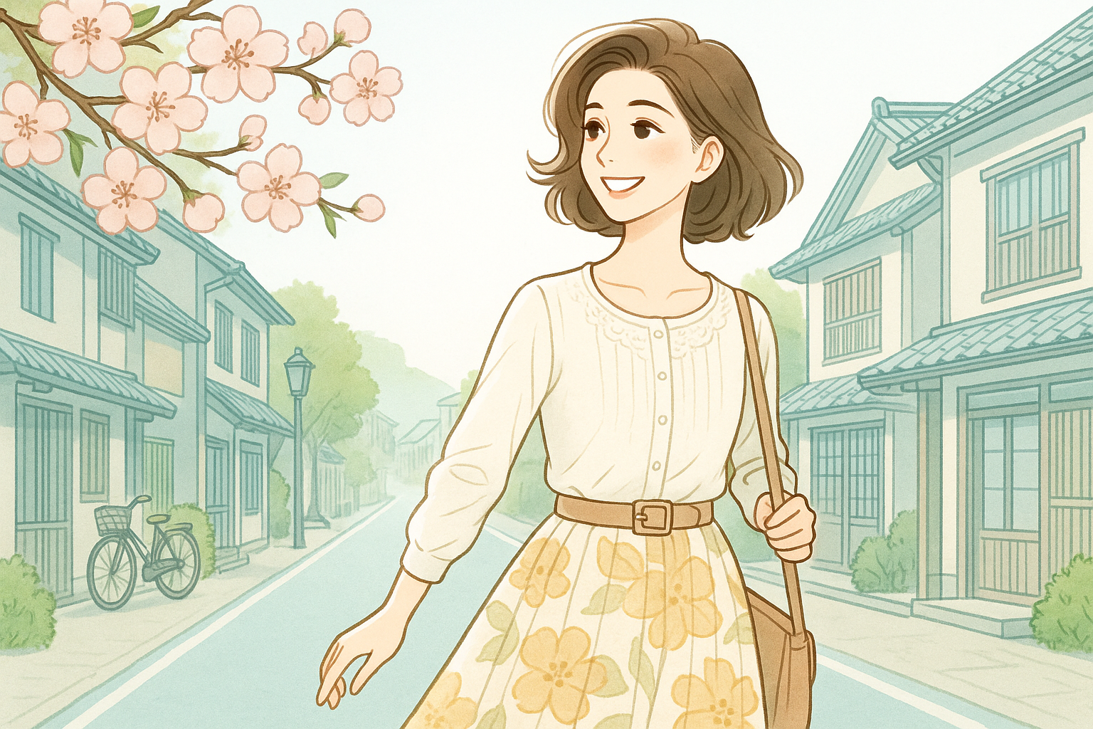 たとえば、ロングスカートにシャツ、足元はスニーカーで散歩へ――そんなシンプルな装いでも、自分に似合う服を選ぶと、自然と背筋が伸びる気がします。